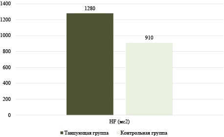 Измерения вариабельности сердечного ритма (ВСР) показали статистически значимое увеличение высокочастотных компонент (HF) у танцующих (среднее увеличение на 24,8 %), что свидетельствует о повышении активности парасимпатической нервной системы. Это указывает на снижение уровня хронического стресса и улучшение вегетативной регуляции, что имеет отражение на рисунке.
