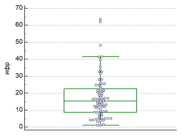 В зоне от 25-го до 75-го перцентиля были расположены показатели ИФР-1, свойственные 50% обследованных недоношенных детей. В зонах от 25-го до 10-го и от 75-го до 90-го перцентиля находились величины уровней ИФР-1 ниже или выше среднего, свойственных 15% недоношенных новорождённых. У 10% детей отмечены низкие и высокие показатели, которые располагались соответственно ниже 10-го и выше 90-го перцентиля. Границы распределения уровня гормона оказалось следующим: 25% –– 8,71; 50% –– 15,41; 75% –– 22,62; 10 и 90% –– 4,14 и 33,53 соответственно; 0 и 100% –– 1,0 и 63,56 мкг/л соответственно. Доверительный интервал значений содержания ИФР-1 в крови недоношенных новорождённых детей составил 8,7-22,6 мкг/л.