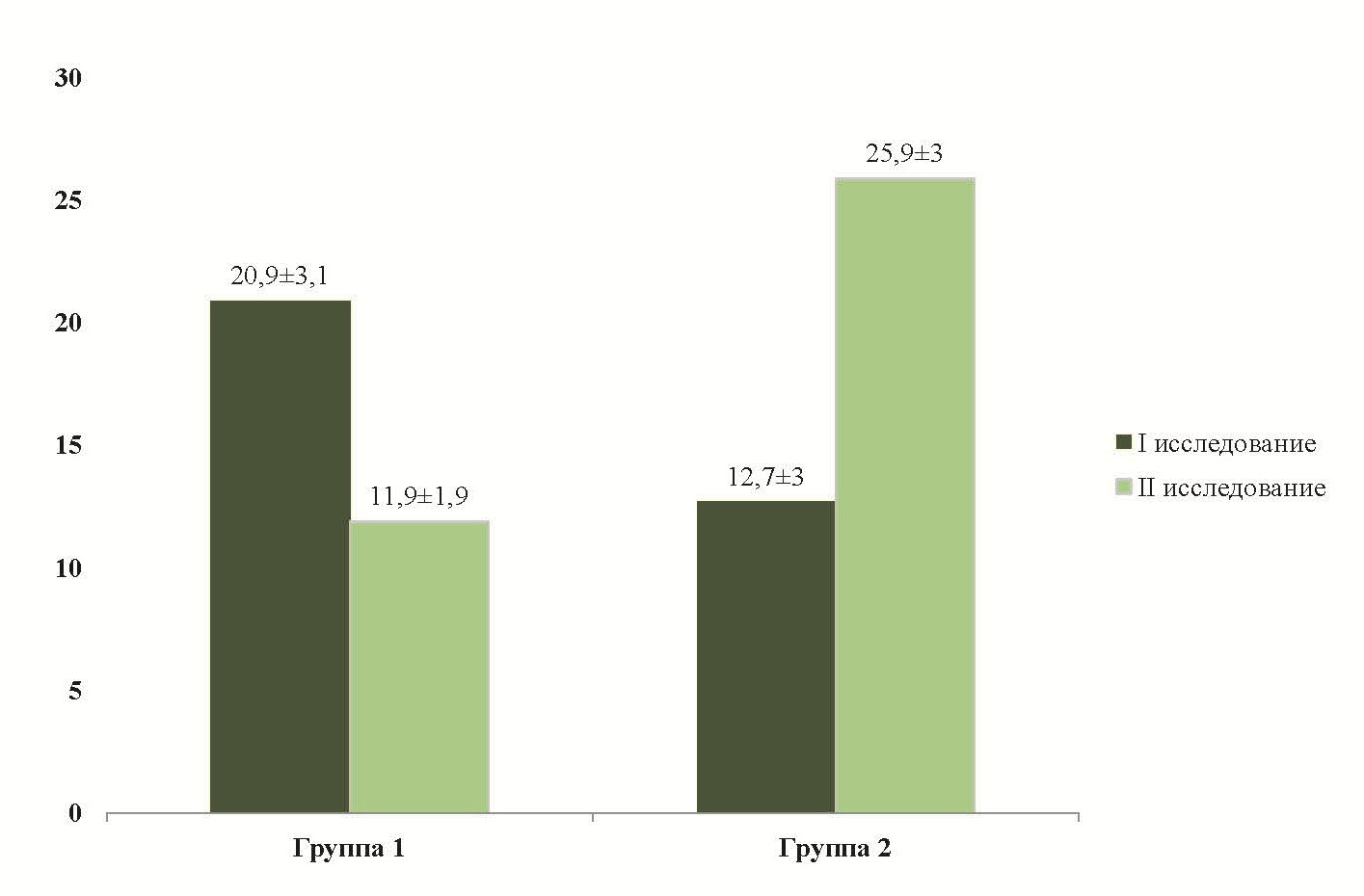 У детей первой группы в раннем неонатальном периоде был отмечен высокий уровень гормона и его снижение при втором исследовании. У детей второй группы первоначальный относительно низкий уровень гормона повышался при повторном исследовании. Изменения уровня ИФР-1 в динамике и различие между группами при обоих исследованиях были достоверными. Очевидно, что на первоначальные уровни гормона в обеих группах детей определённое влияние оказывали условия антенатального развития. В акушерском анамнезе матерей в первой группе с частотой 55% отмечены локальные острые формы или обострения хронических воспалительных бронхолёгочных и урогенитальных заболеваний. У матерей во второй группе с частотой 52% отмечены артериальная гипо- или гипертония, анемия, преэклампсия. Различия в структуре патологических состояний внутри групп и между группами были достоверными (p <0,05). Гестационный возраст и масса тела при рождении (M±m) у детей 1 и 2 групп составил 31±0,5 и 32±0,6 недель (р>0,05), 1460±81 и 1682±98 г (p <0,05) соответственно. Эти данные характеризуют детей 1 группы как менее зрелыми.