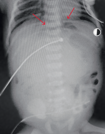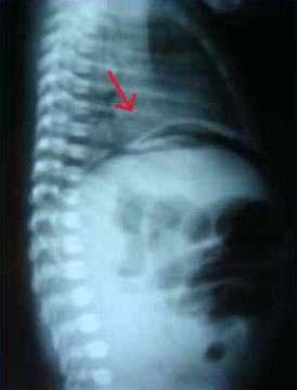 В возрасте 37 часов жизни с диагнозом кишечная непроходимость, перфорация полого органа для хирургической помощи перегоспитализирован в реанимационное отделение новорождённых ОДКБ в тяжёлом состоянии на ИВЛ. На рентгенограммах органов брюшной полости выявлен симптом «серпа», характерный для пневмоперитонеума (рис. 4).