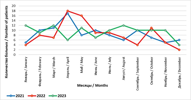 Заболевание регистрировалось в течение всего года (см. рис. 1) с некоторым преобладанием в весенне-летний период –– 184 (58,2%) и наибольшим количеством пациентов в этом сезоне в 2022 году.
