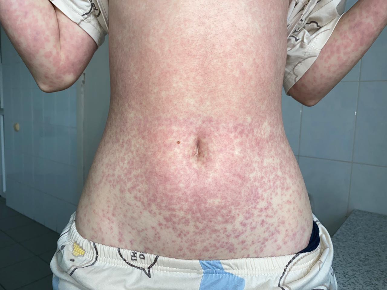 Сыпь на коже отмечалась у 63 (19,9%) детей, появлялась на 8,63±0,08 день болезни, сопровождалась кожным зудом у 5 (7,9%) человек. У 50 (79,4%) больных сыпь была пятнисто-папулёзной, у 6 (9,5%) –– мелкоточечной, у 5 (7,9%) –– папулёзной и у 2 (3,2%) –– петехиальной. У 47 (74,6%) детей наблюдалась экзантема ярко-красного цвета, у остальных –– бледно-розового. У 55 (87,3%) человек выявлялись множественные элементы сыпи. У 44 (69,8%) пациентов высыпания распространялись по всему телу, у остальных элементы были изолированными на лице, туловище или конечностях. У 43 (68,3%) детей экзантема была связана с приёмом на догоспитальном этапе полусинтетических пенициллинов (амоксициллин, амоксициллин/клавулановая кислота).