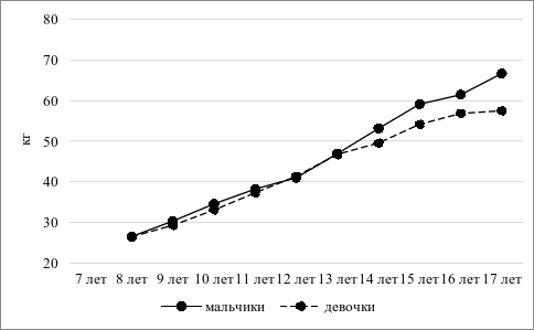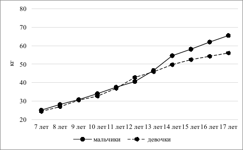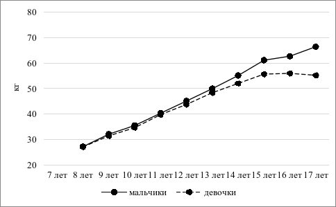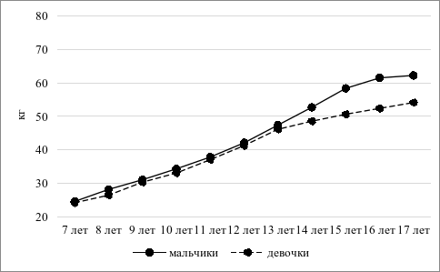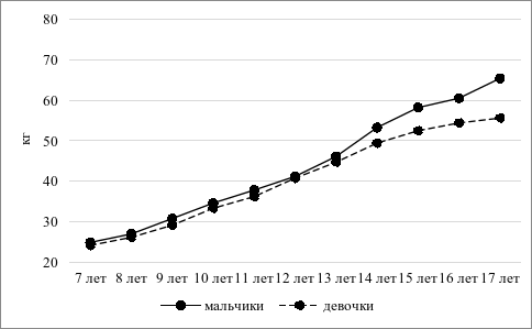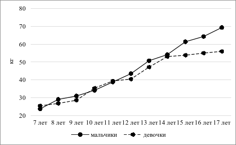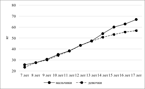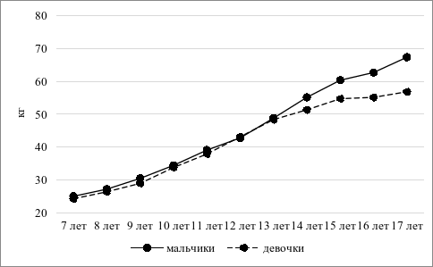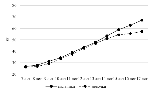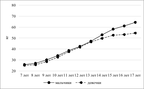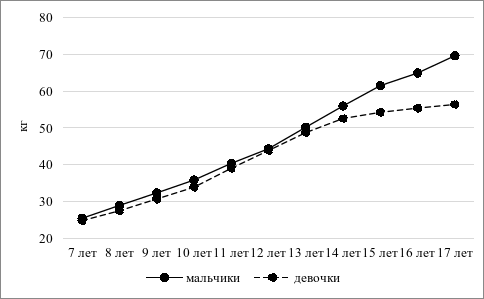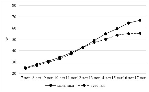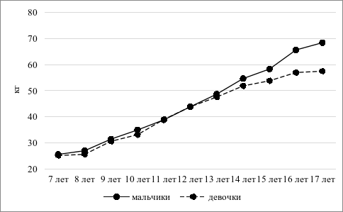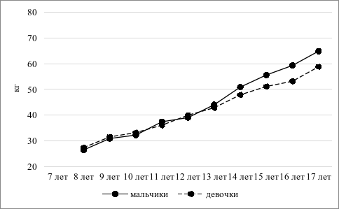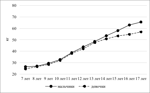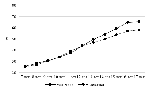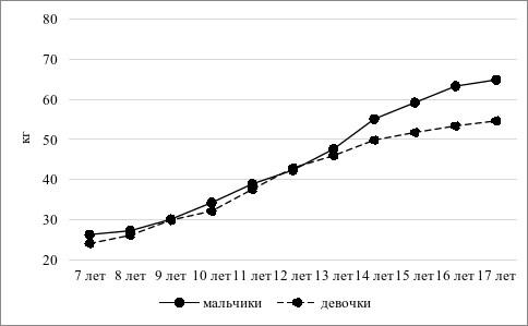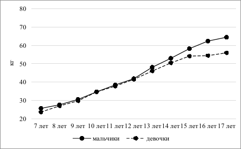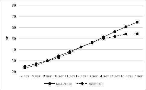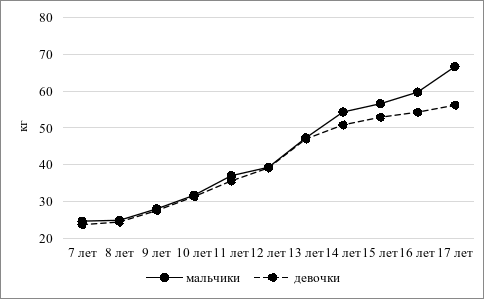 Рис. 2. Кривые массы тела школьников 7-17 лет, проживающих в СЗФО