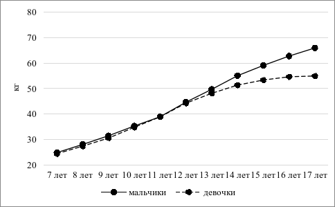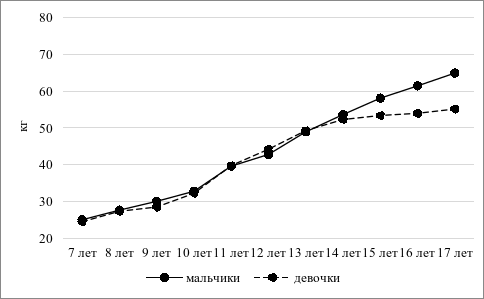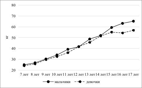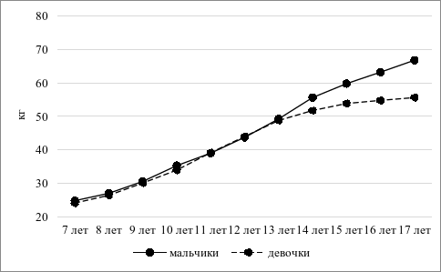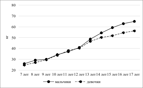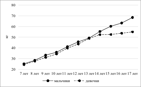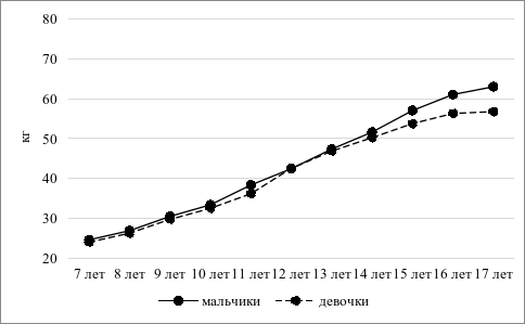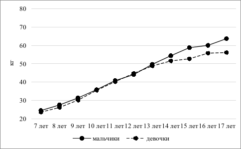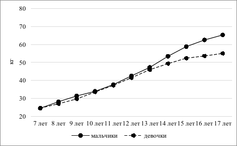 Рис. 5. Кривые массы тела школьников 7-17 лет, проживающих в ПФО
