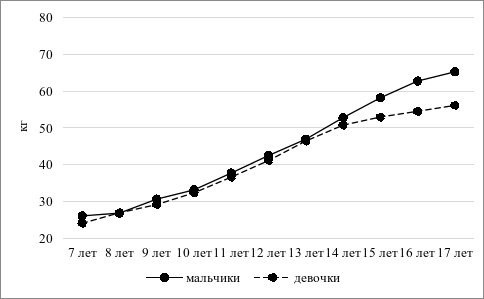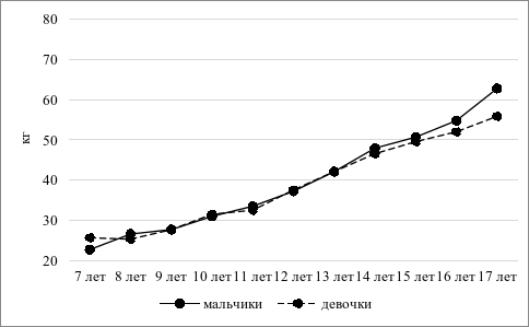 Рис. 6. Кривые массы тела школьников 7-17 лет, проживающих в УФО